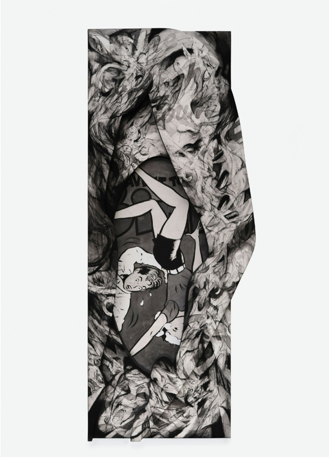 Charcoal, ink, and paint on paper mounted on aluminium panel