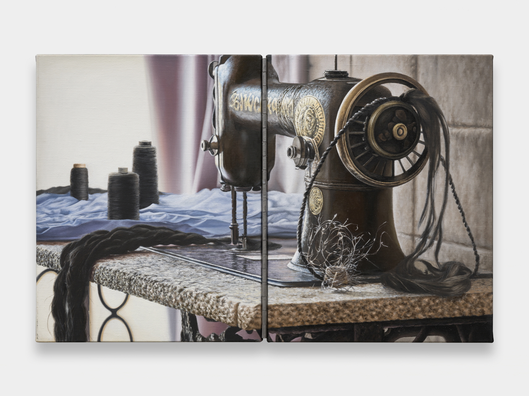 Sun Woo, Text and Textile III, 2025, Oil on linen and stainless steel, 41 x 64 x 4 cm ©Artist