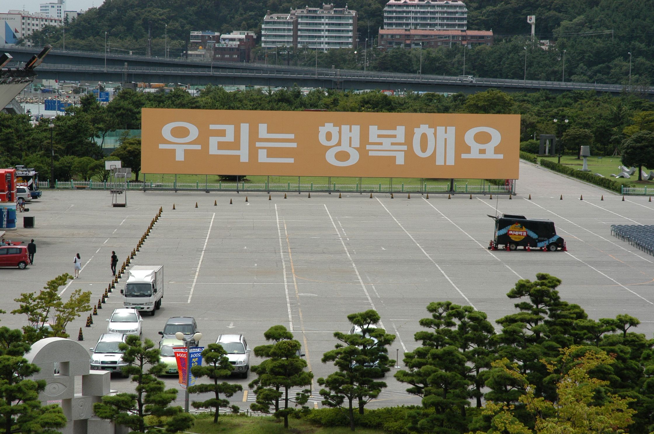 Among the works exhibited at the Busan Biennale, one piece in particular has drawn attention from both inside and outside the art world: the monumental installation We Are Happy (photo), mounted atop a steel tower in the outdoor exhibition space of the Busan Museum of Art.