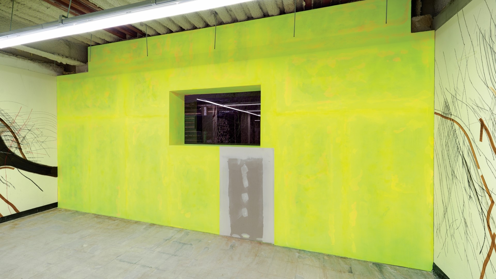 박정우, 〈경계선〉, 2025, 석고보드, 퍼티, 형광 아크릴 물감, 가변크기, 사진: 고정균 ©두산아트센터