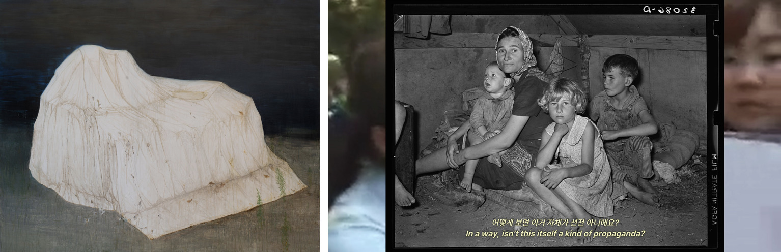 좌) 이해민선, 〈바깥〉, 2018, 면천 위에 아크릴, 182x226cm ©이해민선, 우) 홍진훤, 〈언다큐먼티드 모나리자〉, 2009/2025, 단채널 비디오, 컬러와 흑백, 스테레오 사운드, 22분42초; 아카이벌 피그먼트 프린트, 110×146.6cm ©홍진훤