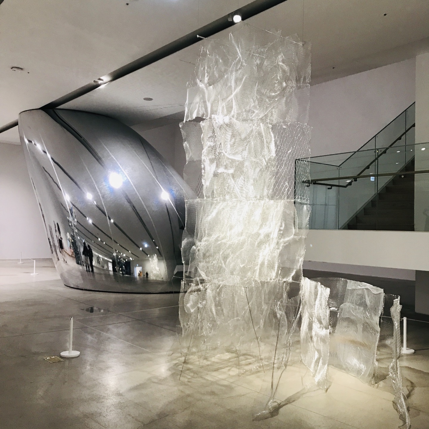 Installation view of Jihyun Jung’s ‘Filing Public Parts (공공조각파일)’ (2018) in “Sculptural Impulse” at the Buk-Seoul Museum of Art, Seoul. SeMA Collection. Photo by Aproject Company.북서울시립미술관의 “조각충동”전에 전시되었던 ‘공공조각파일’(2018)은 길가에 방치된 듯 서 있는 공공 조각을 알루미늄으로 떠 낸 작업이다. 해당 공공 조각은 그의 작업실 근처 건물 벽 쪽에 웅크린 모양으로 앉아 있는 여성 나체 조각상이었다. 작가가 보았을 때 이 조각상은 실제 사람 크기보다 크고 모습도 비범해 주변 환경과 어울리지 않았다. 작가는 가볍고 얇은 알루미늄 망으로 동상을 감싸고 눌러 동상의 외피를 부분 부분 떠 냈다. 동상을 본뜬 수십 장의 알루미늄 망은 미술관 전시장에 높이 쌓아 올려 배치되었다.