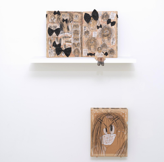 Shin Min, 2025, pencil, glue, paper, tape on canvas and plaster, 41 × 32 cm (each) diptych, 16(h) × 11 × 9 cm (sculpture), 43.5(h) × 33.5 × 10 cm (box)