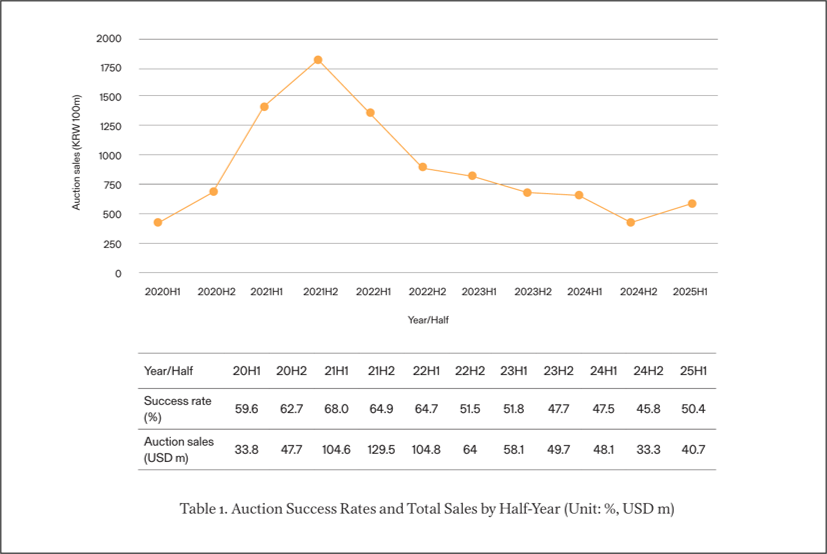 Korean auction total value was KRW 46.1 billion (≈ USD 33.3 million) hitting a post-pandemic low; in H1 2025 it