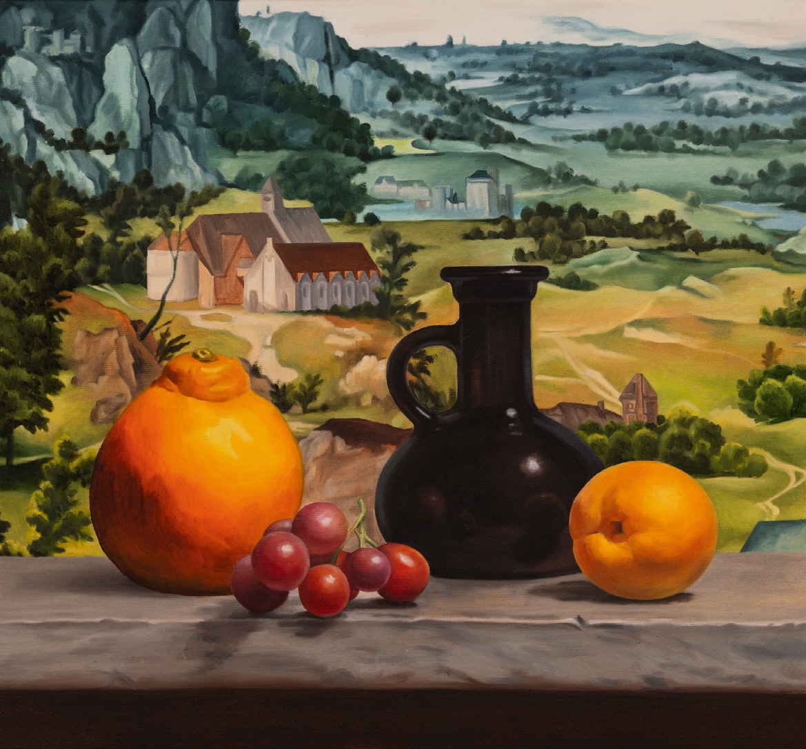 〈Still Life with Black Jug and Fruits〉, 2023, Oil on canvas, 60 x 64 cm