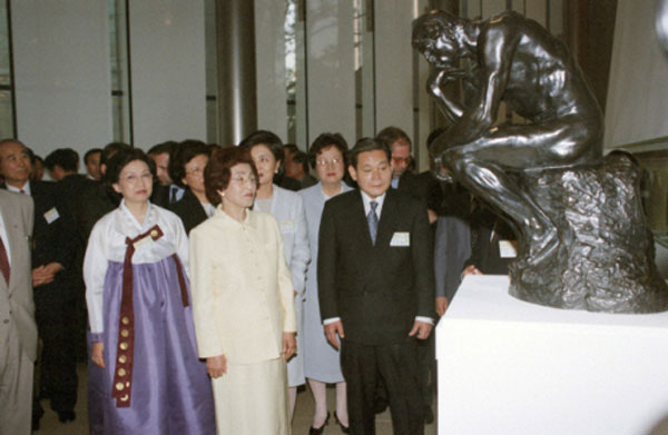 The late Samsung Chairman Lee Kun-hee (far right) is viewing artworks at the Rodin Gallery, which opened in May 1995 at Samsung Plaza in Jung-gu, Seoul, alongside the late Mrs. Lee Hee-ho and Honorary Director of Leeum Museum of Art Hong Ra-hee. ©Yonhap News