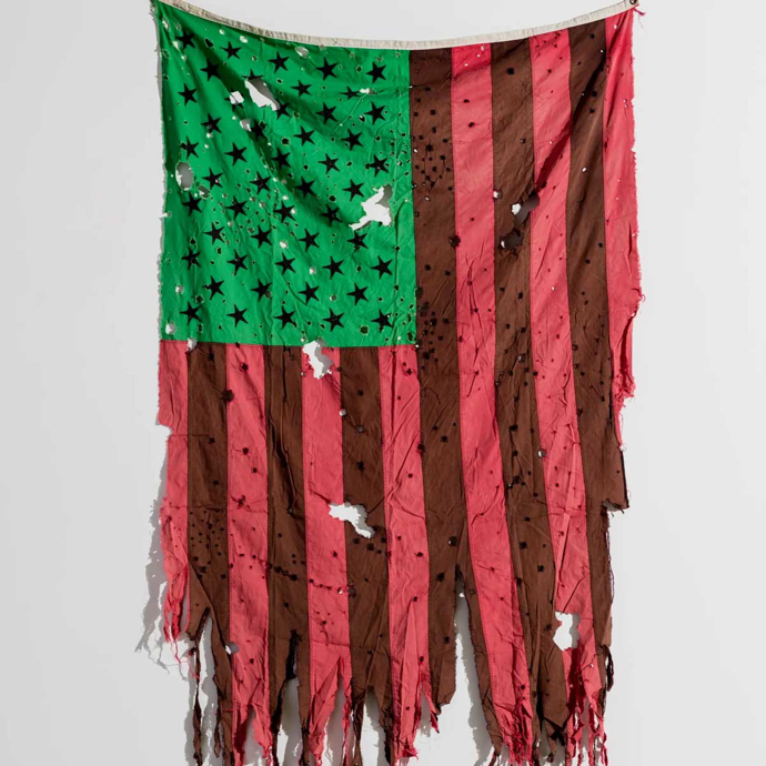 This work replaces the colors of the U.S. flag with those of the Black Liberation Movement, fundamentally questioning the foundations of American national identity. Red signifies the history of bloodshed and violence endured by Black communities; black represents the Black body, identity, and political existence; green symbolizes the future, hope, and vitality of the African diaspora. The torn and damaged surface materializes these historical scars, making the work one of the most powerful moments in Black conceptual art to subvert a national symbol.