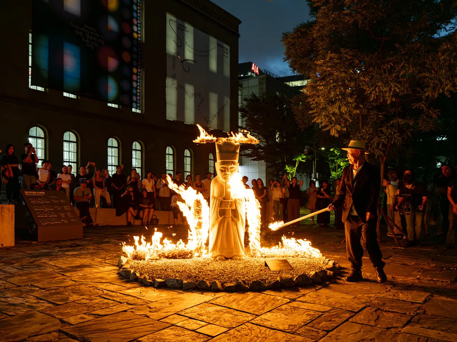The 13th Seoul Mediacity Biennale 《Séance: Technology of Spirit》 Opening performance, Reenactment of Burning Performance. Artist: Seung-taek Lee. Seoul Museum of Art, 2025. 08. 25. Photo: Hong Cheolki ⓒSeoul Mediacity Biennale