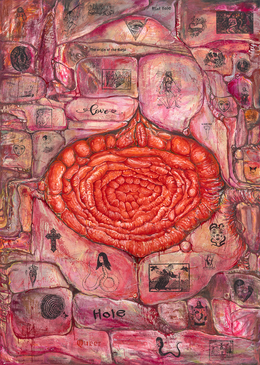 Jang Pa, Gore Deco – The Origin of the World, 2025, Oil, oil pastel, silkscreen, transfer print on linen, 227.3 x 162.1 cm, Courtesy of the artist and Kukje Gallery, Photo by Chunho An. ©Kukje Gallery
