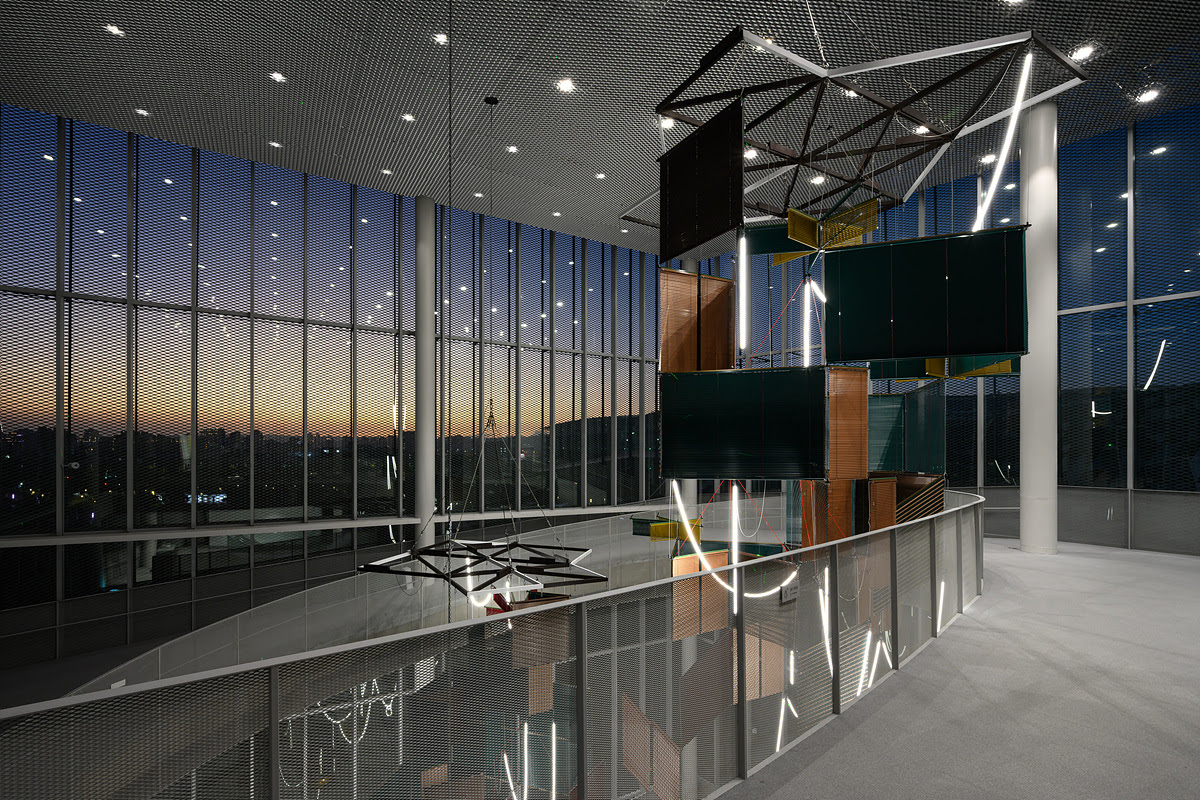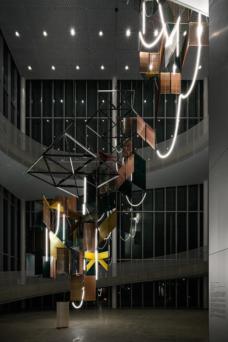 occupies the museum’s 27-meter-high lobby, suspended from the ceiling in the
