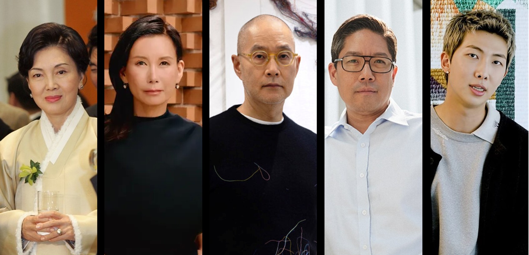 From left: Hong Ra-hee (Honorary Director, Leeum Museum of Art), Tina Kim (Tina Kim Gallery), Do Ho Suh (artist), Patrick Lee (Director, Frieze Seoul), RM (BTS).