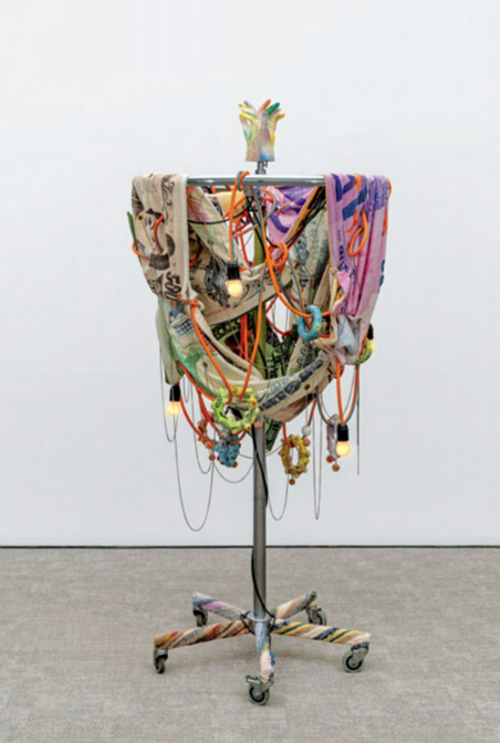 Haegue Yang, Towel Light Sculpture – Budget Pantomime of 600 Dollar, 700 Euro and 22000 Yen, 2012, clothing rack, casters, light bulbs, cable, cord, printed towel, knitting yarn, styrofoam hands, papier-mâché, watercolor, varnish, cowrie shells, seashells, sequins beads, aluminum reflector, 93 × 75 × 20(h) cm. / Photo: K Auction Website