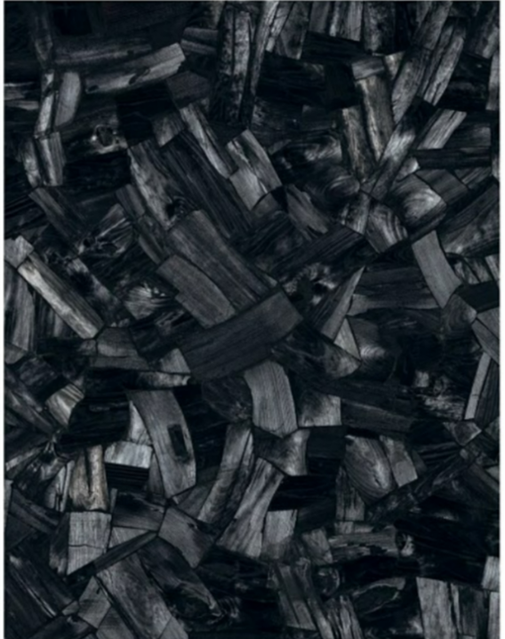 charcoal accumulate to form dense black surfaces, emphasizing materiality and