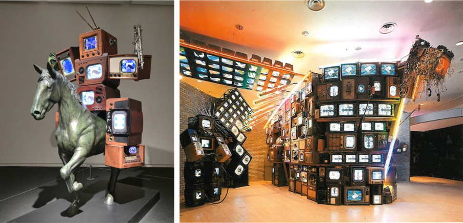 (Left) Nam June Paik, Ancient Horseman, 1991 / Photo courtesy: Wooyang Museum of Contemporary Art, (Right) The Fractal Turtle Ship exhibited at the 1993 Daejeon Expo. In the background, another TV work by Nam June Paik, Madame Curie, is visible. / Photo: Daejeon Museum of Art