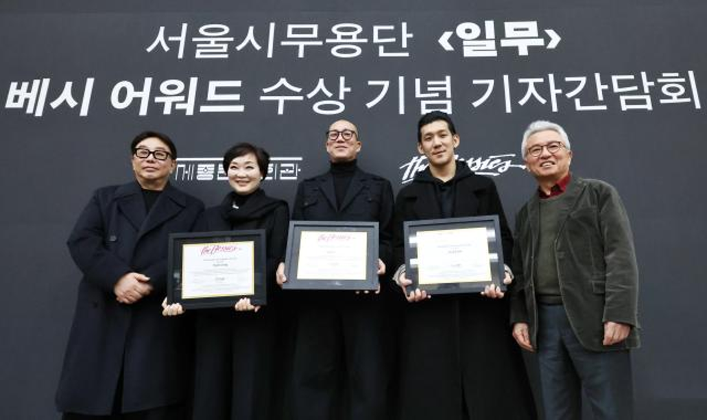 Attendees pose for a commemorative photo at a press conference celebrating the Seoul Metropolitan Dance Theater's Bessie Award win for Ilmu (One Dance).