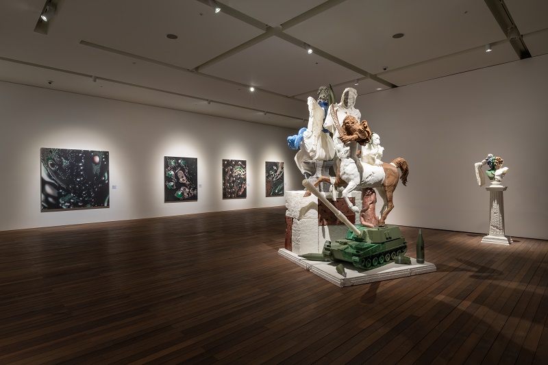 works, contemporary anxieties and fractures come to the fore—ranging from