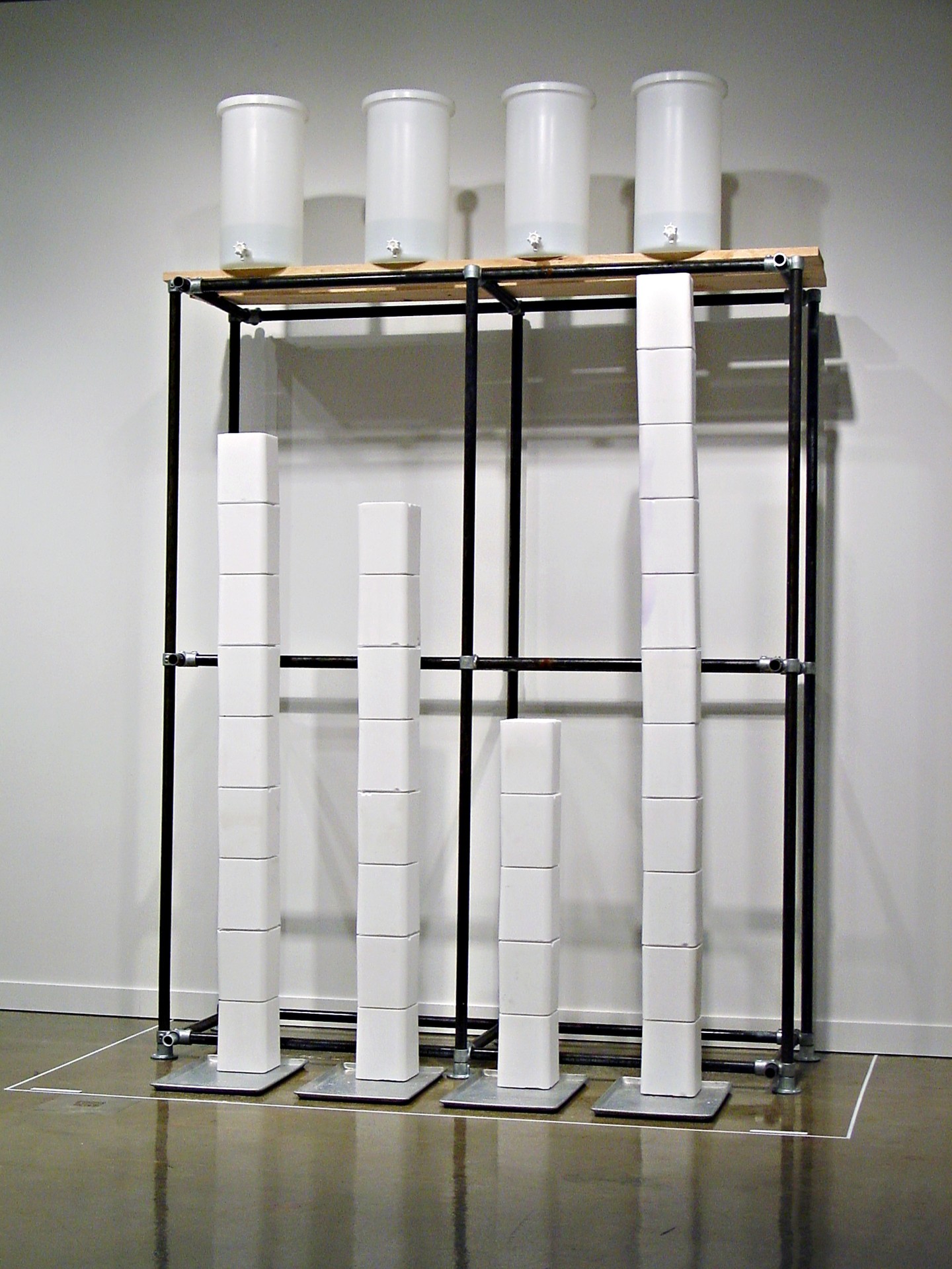 Michael Joo, Saltiness of Greatness, 1992, compressed salt blocks, engraved aluminium trays, steel, wood, polyethylene, synthetic sweat, 156 x 96 x 48 in. Private Collection. Photo: Tim Lloyd ©Space ZeroOne