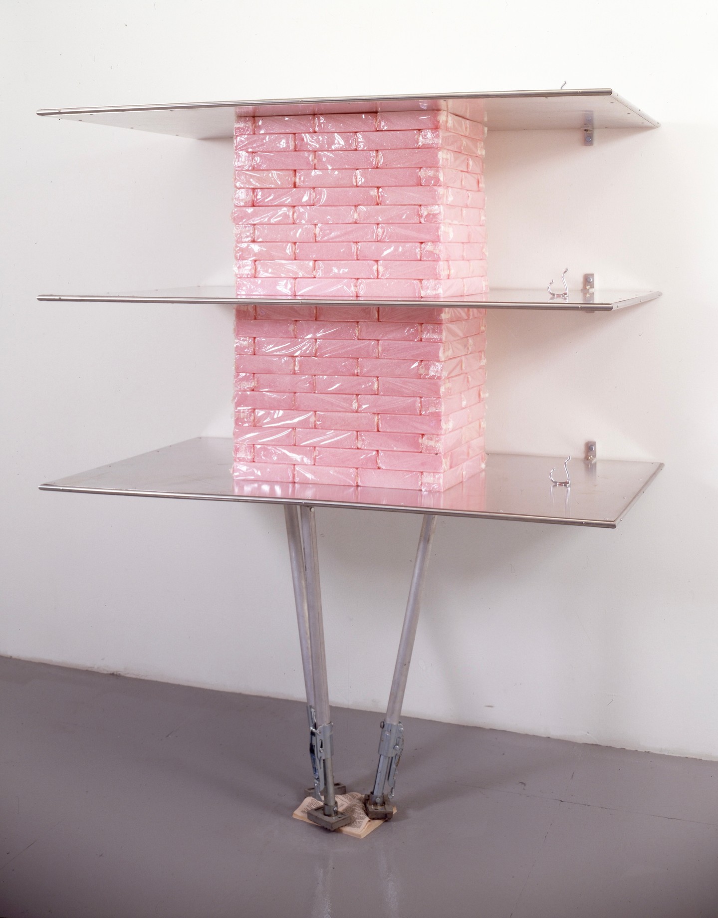 Michael Joo, Sapphic Bunkbed (Pos.69), 1993, aluminium, urinal cakes, stainless steel, expansion poles, book, 85 x 76 x 35 in. Courtesy of the Artist and Kukje Gallery. Photo: Adam Reich ©Space ZeroOne