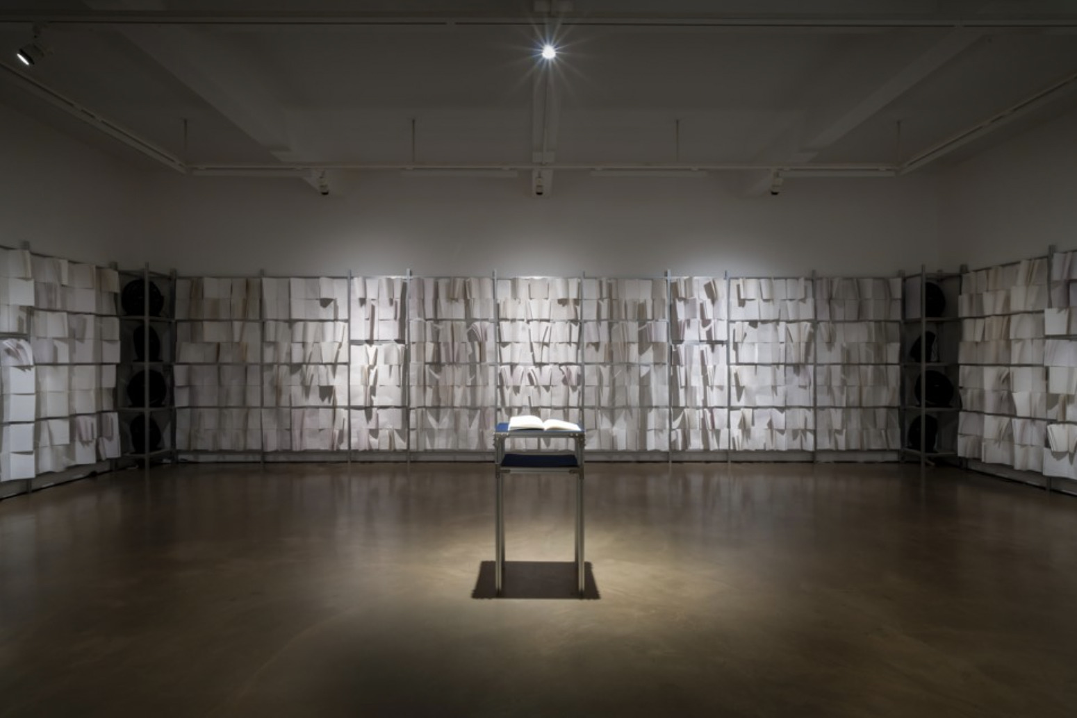 presents approximately one thousand Braille books alongside sculptural and