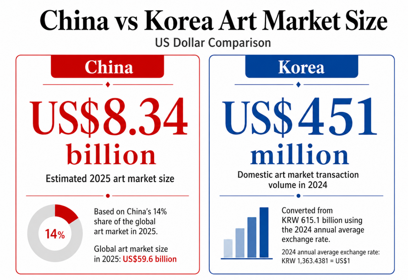 Sources: Art Basel & UBS Global Art Market Report 2026; Korea Arts Management Service, 2025 Art Market Survey (based on 2024 data); FRED annual exchange rate data.