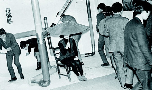 ‘A Happening with a Vinyl Umbrella and a Candle,’ (1967). Performed by Mudongin (Zero Group) and Sinjeon dongin (New Exhibition Group). Photograph. Courtesy of the artists and the Asia Culture Center.