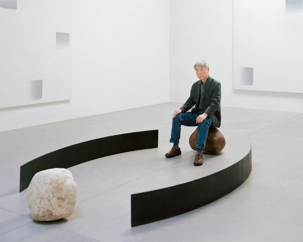 Lee Ufan sitting on Relatum. Photo by Curtis Hamilton. ©ArtAsiaPacific